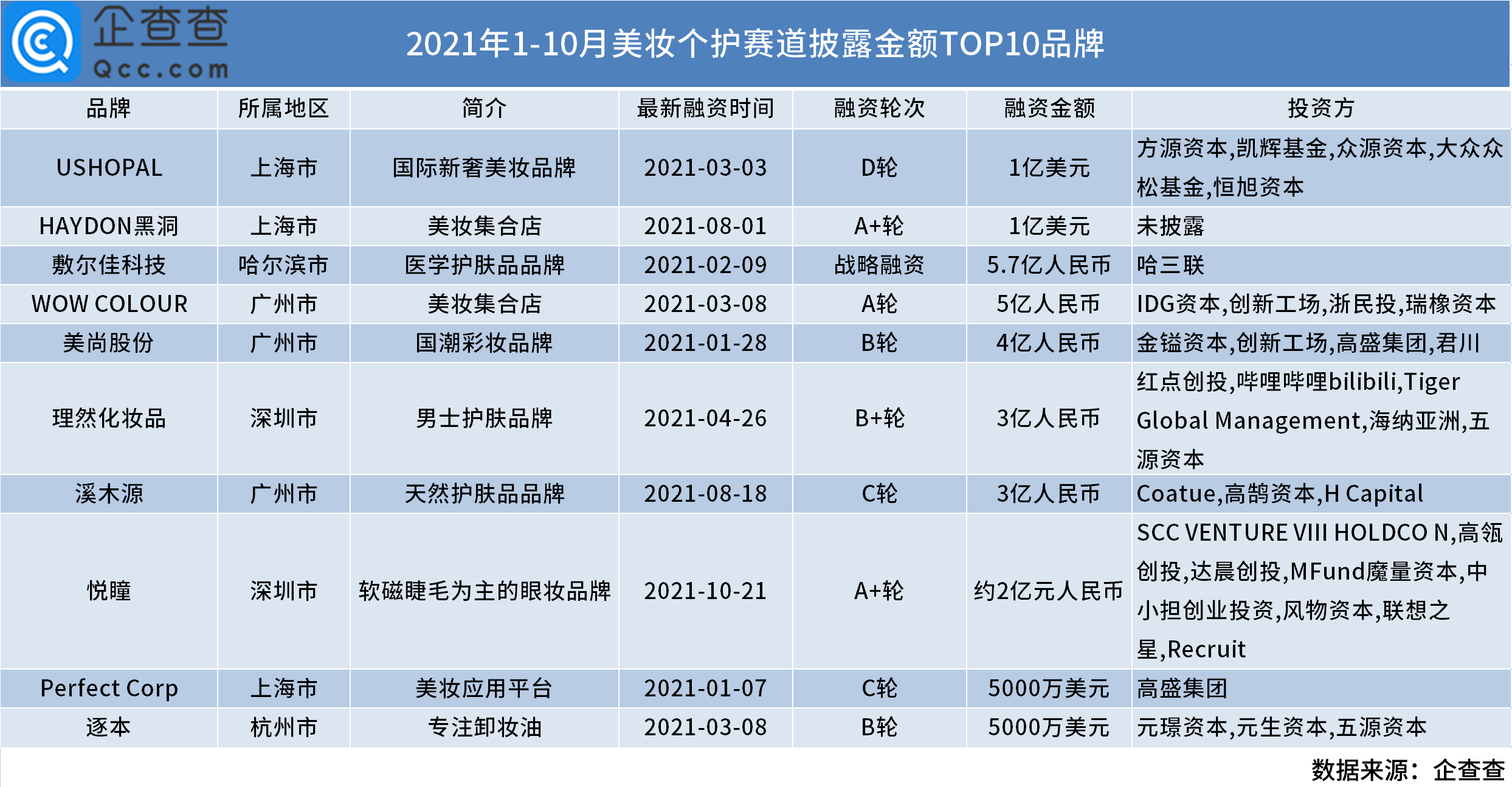 企查查数据显示,截至目前,2021年美妆赛道共发生77起投融资事件,披露总金额超61亿人民币。1月美妆赛道共发生12起投融资事件,披露总金额超10亿元。3月投融资事件数量和披露金额均达到今年最高,共 16起,披露金额超16亿人民币,其中美妆集合店“WOW COLOUR”、新奢美妆品牌“USHOPAL”以及卸妆油品牌“逐本”单笔融资均超亿级,尤其“USHOPAL”超1亿美元、“WOW COLOUR”单笔融资高达5亿人民币。