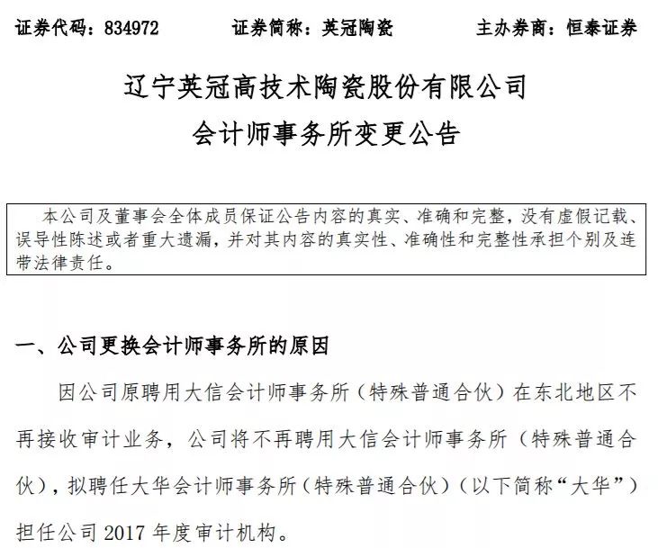新三板挂牌的英冠陶瓷不久前更换了会计师事务所,原本是一件平常之事,理由却很奇葩:原会计师事务所在东北地区不再接收审计业务。