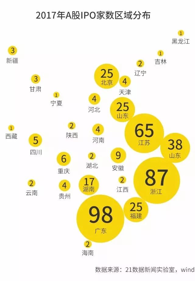 如果把视野放宽到全国,面临困局的绝非东北一地。从2017年IPO公司区域分布能够明显的看出,沿海各省市与内地在资本市场上存在着鸿沟式差距。如果把沿海IPO数上双、甚至近百的各省称为第一集团,中部各省勉强可称之为第二集团,东北、西北以及西南一线则基本处于“掉队”的状态,2017年的“IPO红利”可以说基本上与它们无关。
