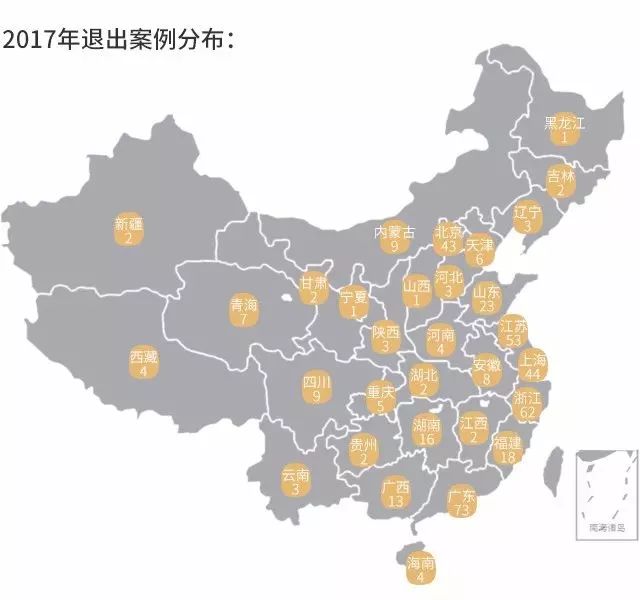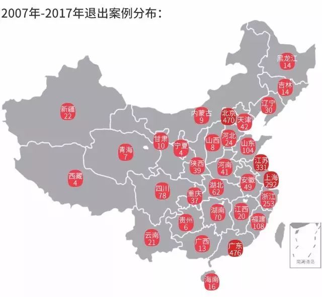 根据投中研究院收录的2007年至2017年十年时间,约3000个真实的私募股权基金退出案例数据,仅广东、北京、江苏、上海、浙江五个省市的退出项目数量就占到了全国的七成!