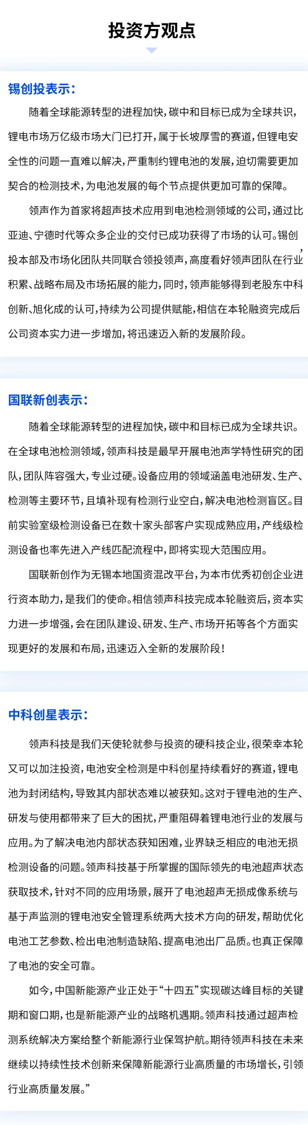 领声科技是一家专注于电池领域声学检测与监测技术和产品研发的企业,其核心团队来自华中科技大学。自成立以来,领声科技已成功完成多轮融资,吸引了众多知名投资机构的关注。此前,领声科技通过实验室级电池超声扫描设备累积了行业内主机厂、电池厂等数十家头部客户,在全球范围内首次实现了电池产业与先进超声技术的碰撞和落地。自上一轮融资以来,领声科技取得了重要的里程碑式进展,进一步推出了产线级电池超声在线全检解决方案并布局了电池使用过程中的在线监测技术。