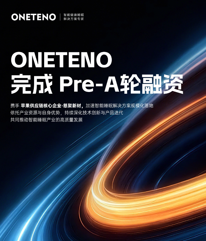 2025年12月,智能睡眠整体解决方案创新企业ONETENO宣布完成Pre-A轮融资,由苹果传感器组件核心供应商慈聚新材独家投资,投后估值达数千万人民币。本轮资金将用于核心产品规模化生产落地与高标准质量管控体系建设,为公司进一步深耕智能睡眠赛道奠定基础。