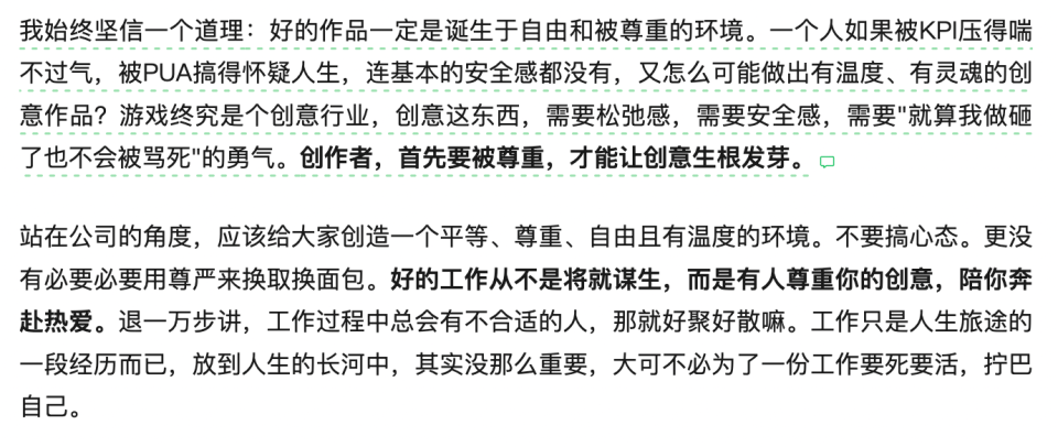 他也在文章中聊到了大公司与小公司的环境区别,“与其在大厂做一颗听话的螺丝钉,不如在小团队做一个能发光的人。”“被否定不可怕,失败也不可怕。但想想自己最青春的年华被一种令人作呕的方式来结束,就很难受。”对此,他认为公司应该创造一个平等、尊重、自由且有温度的环境。