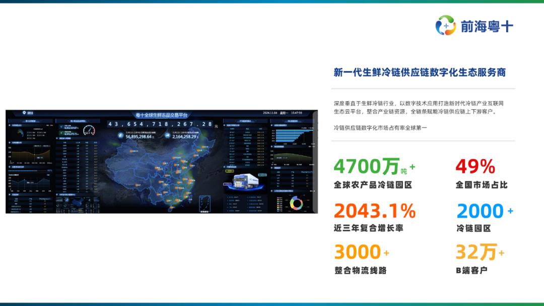 CCS的战略加持,对于前海粤十而言意义非凡,它是粤十在多年市场服务与创新技术科研的沉淀后,于“向内求”发展路径中结出的硕果,更是开启“向外求”战略布局的关键里程碑,为公司的冷链事业开启了全新篇章。作为新一代生鲜冷链供应链数字化生态服务商,前海粤十始终秉持远见格局、开放共赢的核心价值观,全力推动冷链物流智能化升级。本次融资将为前海粤十注入更多资金,加快其在冷链物流领域的发展速度。多年来,前海粤十在冷链信息化细分领域深度耕耘,持续投入数字冷链技术,不断“向内求”,构建了完备的冷链产品矩阵。前海粤十已服务全球超2000个农产品冷链园区,冷库容积达4700万吨,终端农产品客户超32万,运输干线覆盖全国3000多条,近三年复合增长率高达2043.1%,冷链数字化市场占有率居全球之首。