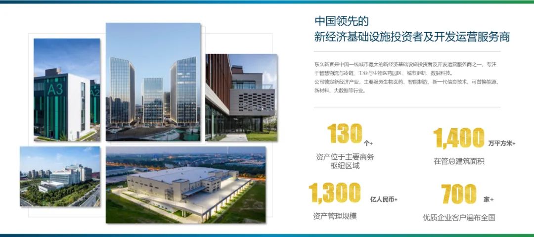 东久新宜是中国新经济基础设施投资与开发运营服务领域的佼佼者,其资产管理规模超190亿美金,总建筑面积逾1400万平方米。东久新宜的智慧物流与冷链、智能制造、生物医药、城市更新这四大业务板块,加上私募股权投资平台东久新宜资本,能够为新经济客户提供全方位、一体化的基础设施运营服务和解决方案,满足客户在研发、生产、仓储、总部办公等多方面的需求,有力助推中国产业升级和科技创新。