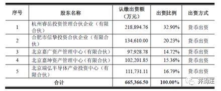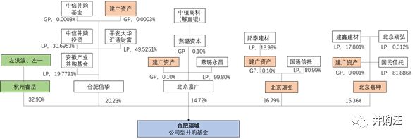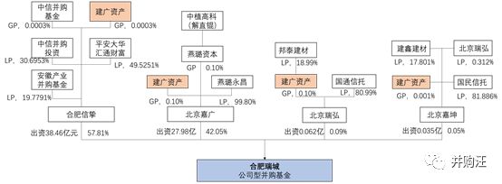 合肥瑞城是一个公司型的并购基金,合计出资为66.54亿元,分别由合肥信挚持股57.81%、北京嘉广持股42.05%,北京瑞弘持股0.09%,北京嘉坤持股0.05%。