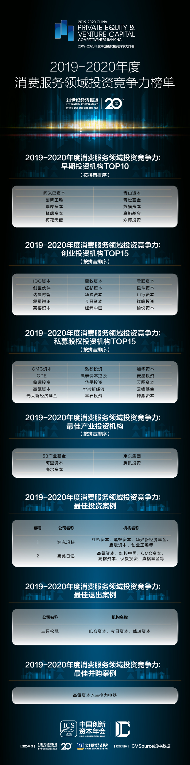 近日,21世纪经济报道、21创新资本研究院通过调研、收集各基金数百家机构的“募投管退”等业绩表现,参考第三方机构CVSource投中数据的数据,结合行业专家评委会对综合治理、合规等方面的考量,评出了“21世纪经济报道2019-2020年度消费服务领域投资机构竞争力榜单”,其中,天图投资获评2019-2020年度消费服务领域投资机构竞争力私募股权投资机构TOP15。