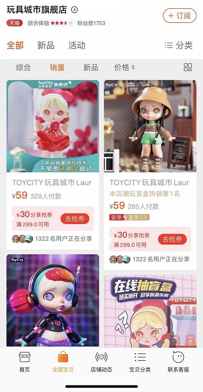 眼下,几乎所有潮流玩具生意都会用盲盒模式引流。界面新闻搜索其天猫官方旗舰店发现,在定价上,ToyCity盲盒售价在49-69元之间,而潮流手办系列定价在500元到1.2万元之间。从销量上看,盲盒类产品是其销售主力,而潮流手办产品月销量都在个位数。其中卖的最好的一款Laura花卉公仔盲盒,售价59元起,月销量达500+。