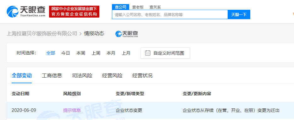 拉夏贝尔企业状态由“存续”变更为“迁出”