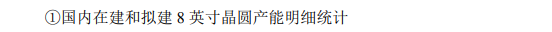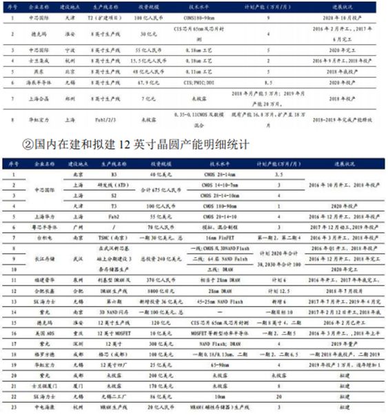 截至 2018 年 7 月,国内在建及拟建 8 英寸在建及拟建 8 英寸晶圆厂对应产能合计为 54.7 万片/月,12 英寸晶圆厂对应产能合计为 108.5 万片/月。