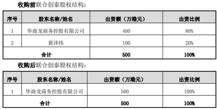 经各方协商,一致同意华商龙控股以 46,000 万元人民币受让黄泽伟先生持有的联合创泰 20%股权。收购完成后,华商龙控股将持有联合创泰 100%的股权。