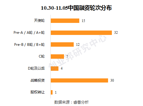 本周融资事件的融资轮次主要集中在前期(天使轮、A轮),共47起,其中A轮有32起;中后期(B轮、C轮、D轮及以后)有23起;战略投资本周有30起。