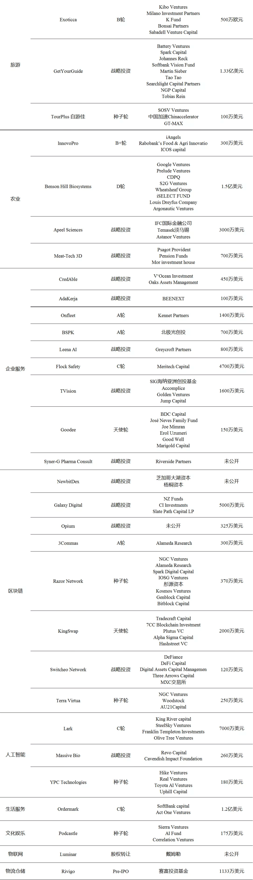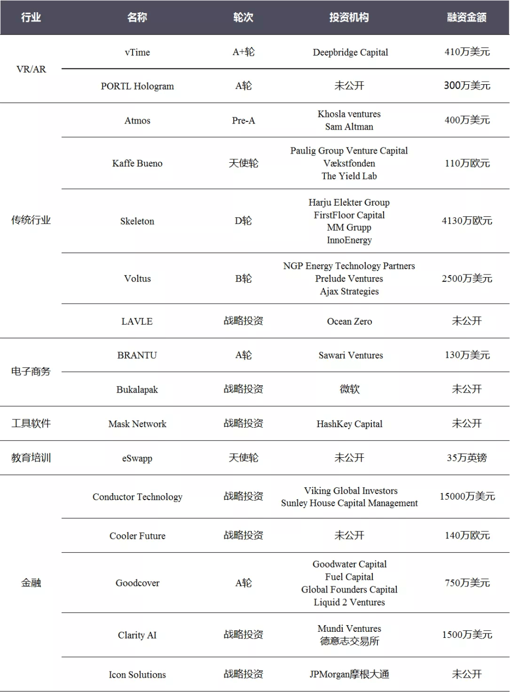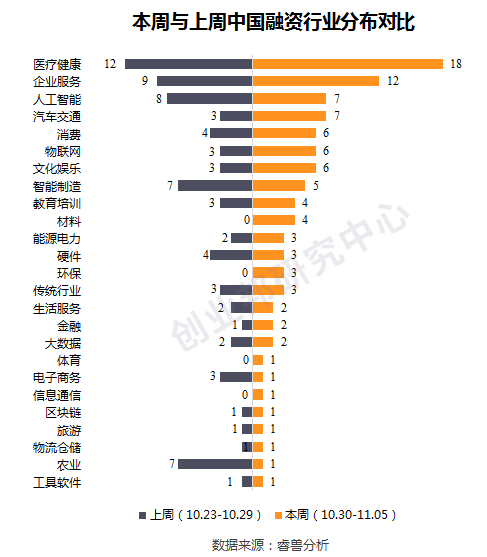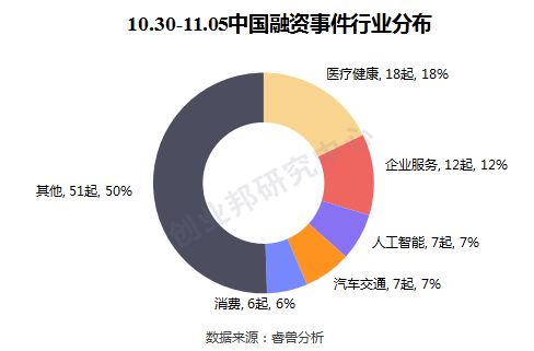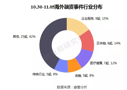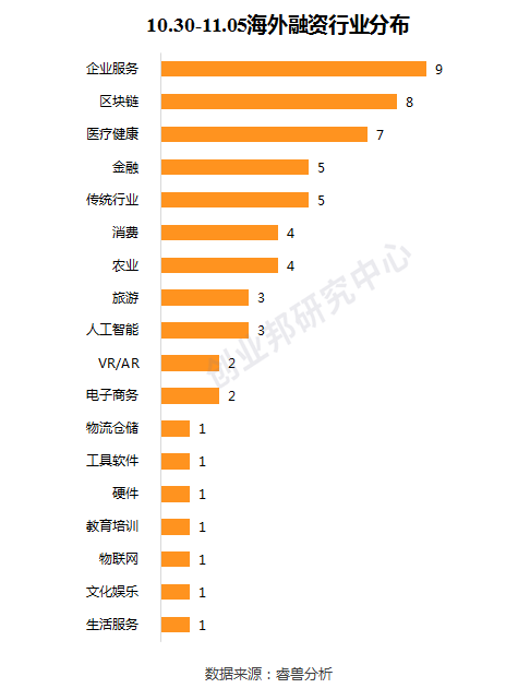 本周披露海外融资事件涉及18个行业领域,其中企业服务9起,区块链8起,医疗健康7起,金融、传统行业并列5起。