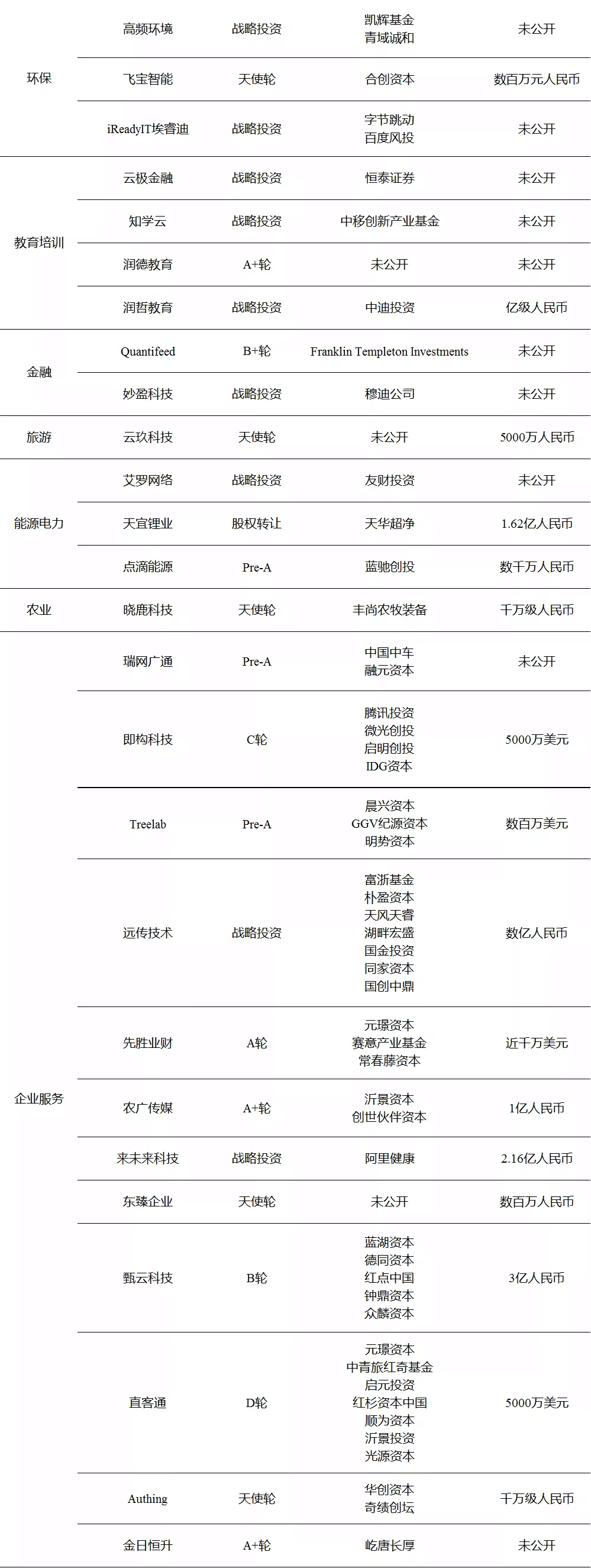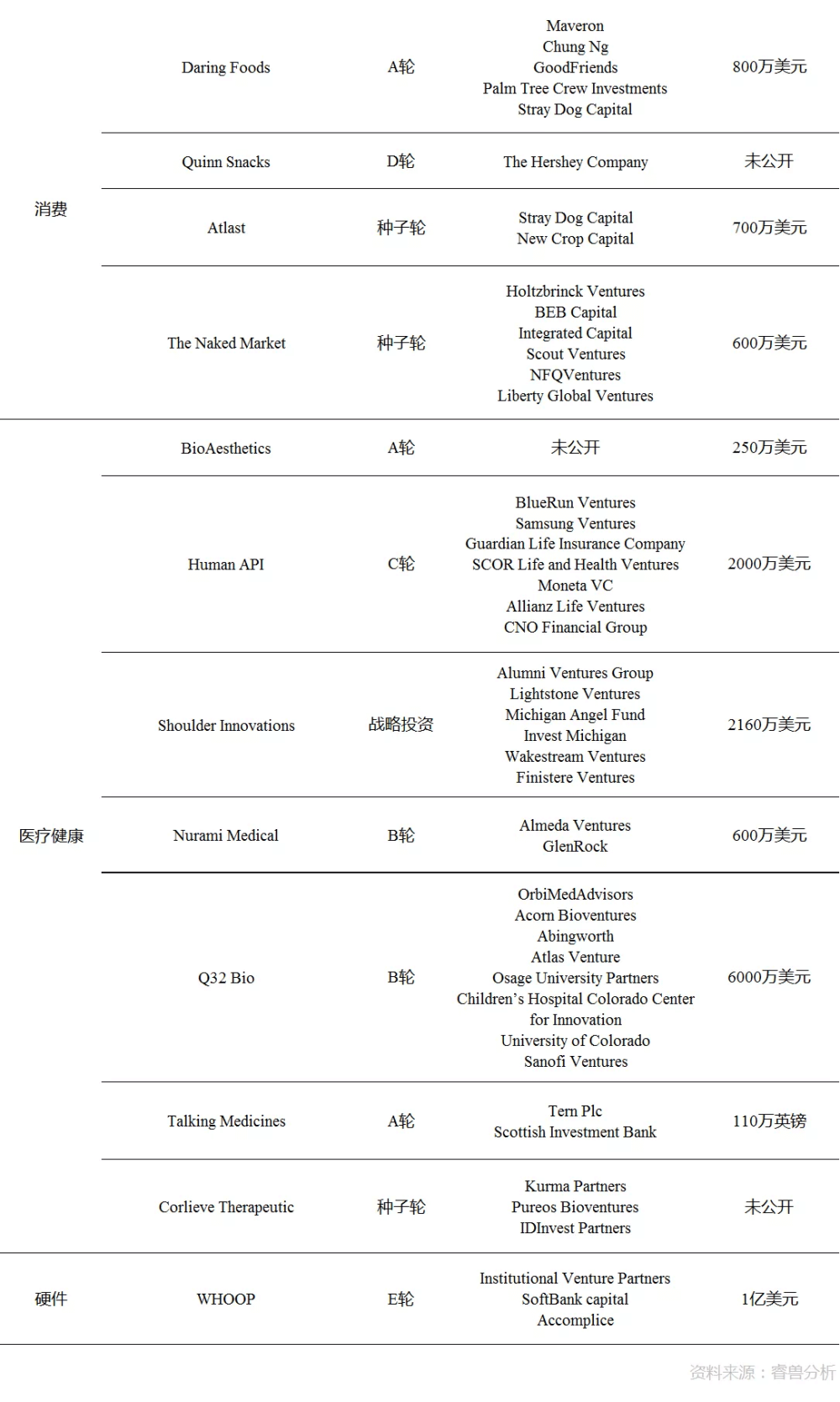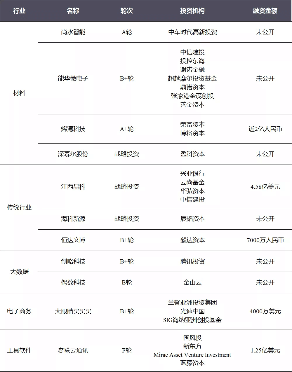 本周披露海外融资事件涉及18个行业领域,其中企业服务9起,区块链8起,医疗健康7起,金融、传统行业并列5起。