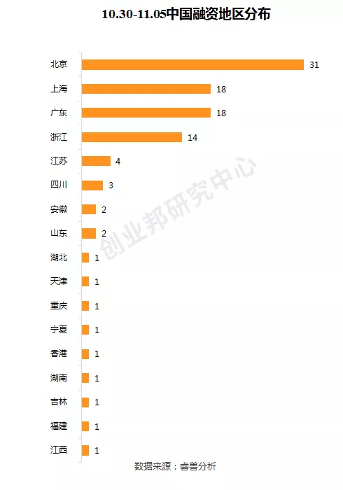 本周北上广融资事件共67起,占比66.34%;浙江有14起事件,江苏有4起。
