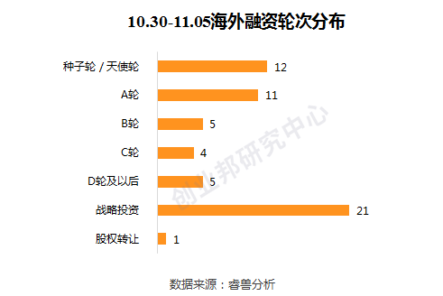本周海外融资事件的融资轮次分布主要集中在前期(种子轮/天使轮、A轮),共23起;中后期(B轮、C轮、D轮及以后)有14起;战略投资本周有21起。