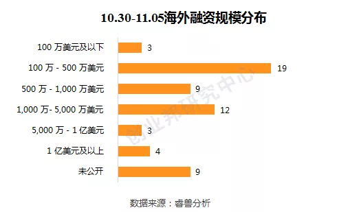 本周海外融资事件的融资规模主要集中在100万-500万美元,共19起。
