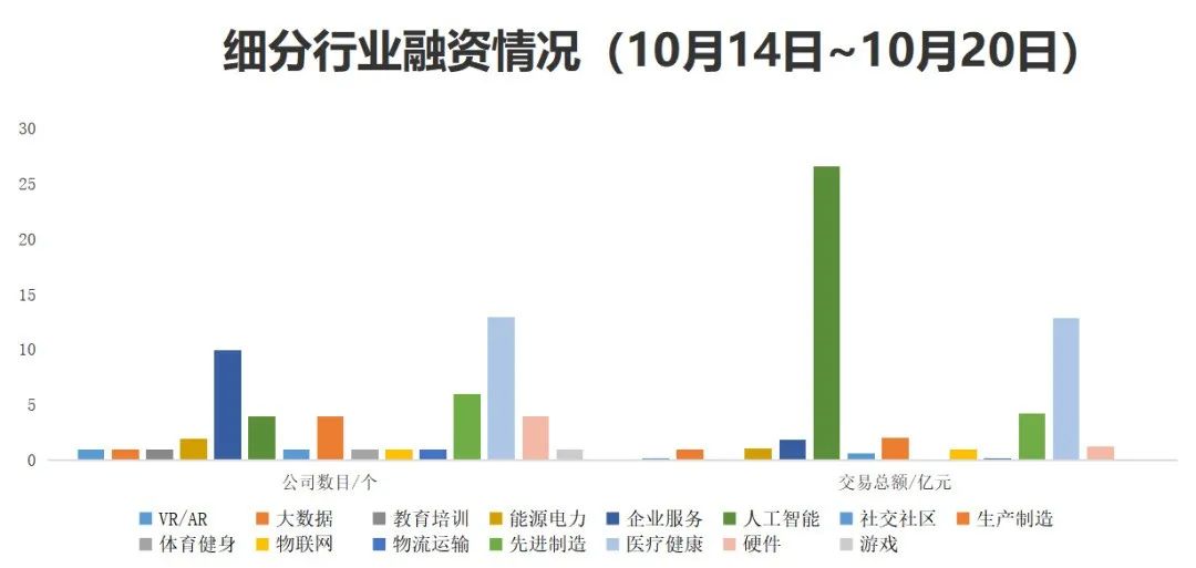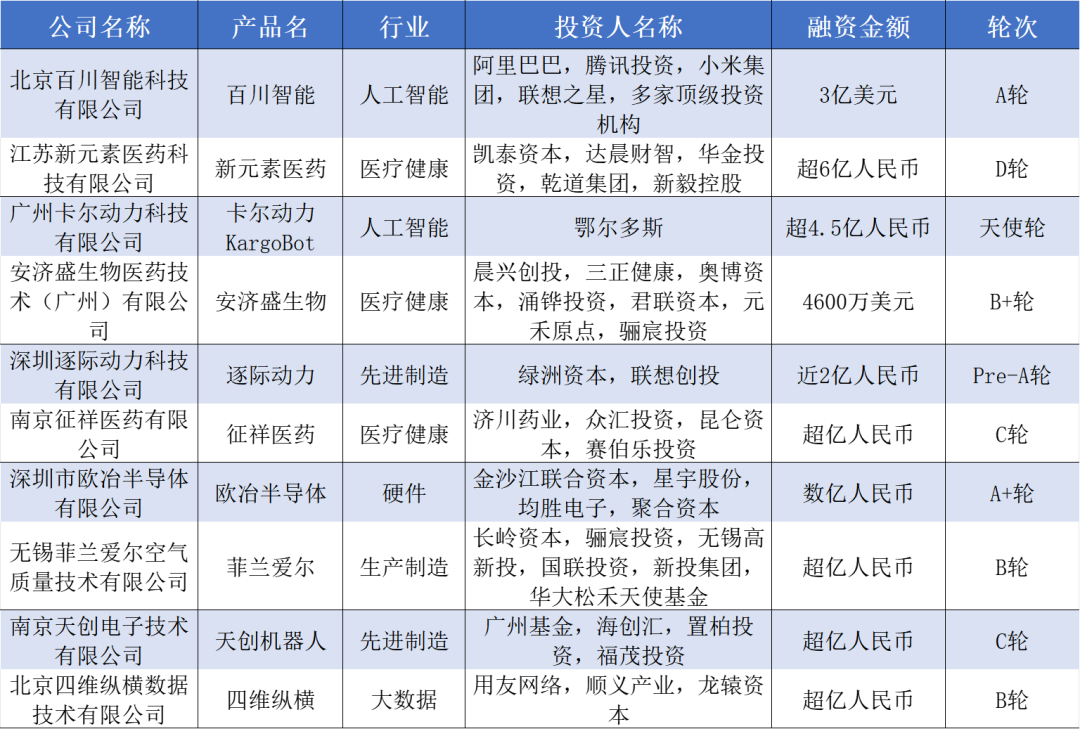 本周融资金额过亿的交易共有10笔,集中在人工智能、医疗健康、先进制造、硬件、生产制造、大数据等行业。