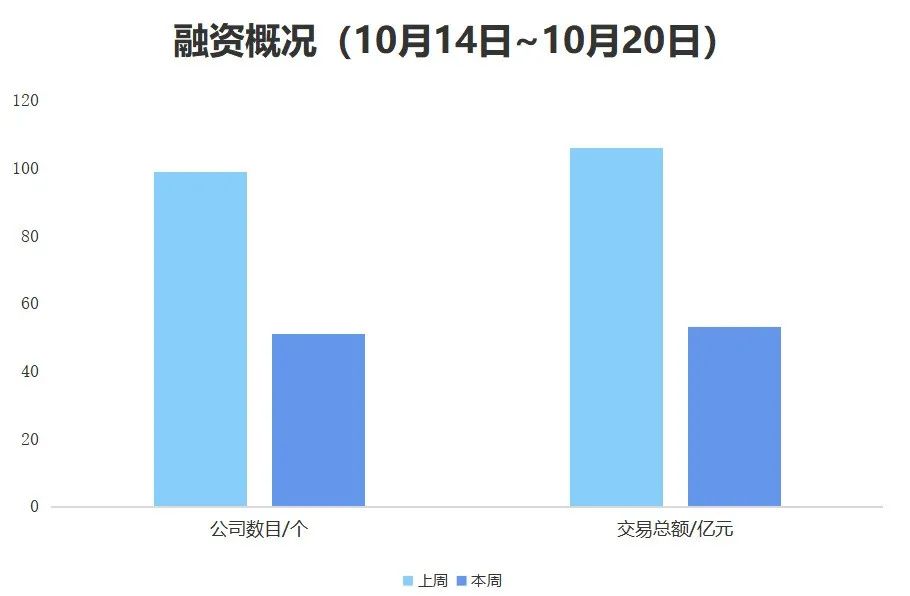 本周(10月14日~10月20日)全国共发生51起融资事件,较上周同比下降48.5%;近一周披露的交易总额约53.05亿人民币,较上周105.99亿人民币同比下降49.9%。本周融资主要分布在医疗健康行业;人工智能行业披露的交易总额最多,达约26.6亿人民币。行业融资概况统计