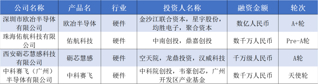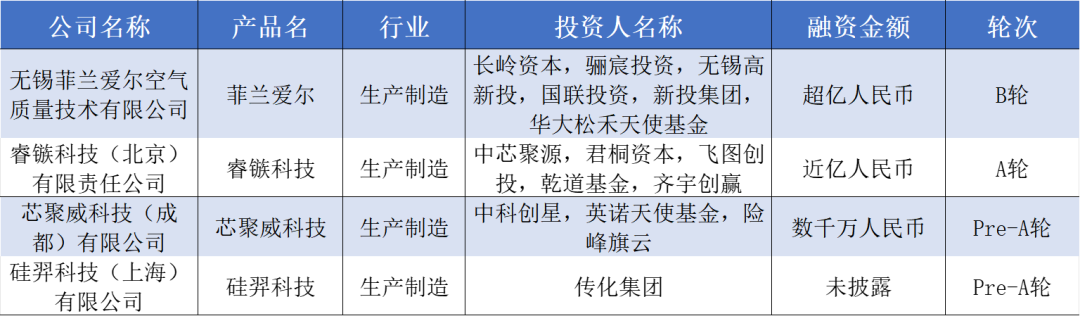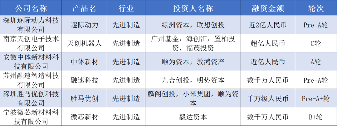 细分行业融资雷鸟创新是一家专注于 AR 领域的新锐创业公司。公司在光学、显示、算法及整机方面,均有多年技术积累与沉淀。公司致力于打造全球消费级AR生态,为用户提供AR产品。北京四维纵横数据技术有限公司开创了超融合数据库品类,一套数据库解决过去关系库、时序库和分析库搭配才能解决的问题,大幅精简技术栈,降低门槛,提升开发运维效率。让人人都是数据专家,而无需关注数据大不大。智慧一加一2010年成立以来始终坚持“让天下没有难教的孩子、让天下没有难念的书”企业愿景。致力于为儿童提供高质量的学习能力训练课程,帮助他们提升“专注力、观察力、记忆力、思维力、学习力、创造力”和解决问题的能力。通过独特的教学方法和互动学习体验,激发孩子们的思维潜能,培养他们的创新精神和批判性思维能力。弘正储能成立于2005年,致力于提供绿色能源综合应用与系统解决方案,聚焦储能领域的技术革新与产品研发,专注于储能领域的技术研发、生产制造和海内外销售。弘正充分运用AI智能、大数据分析、云技术等能源数字化技术,倾力打造以BMS、PCS、EMS、智慧云平台为核心的全系列储能产品,并构建储能系统云边端协同体系,实现储能电站全面感知、智能诊断、协同控制、智慧运维,针对发电侧、电网侧、用户侧等各类场景的不同需求,提供优质的产品和技术解决方案。金睛云华以“AI驱动安全”为核心理念,持续研发基于大数据人工智能技术的新一代安全产品,包括云鉴全流量高级威胁检测系统(ATD)、云踪全流量回溯分析取证系统(TFS)、云网智能欺骗诱捕系统(ADS)、云图大数据安全分析&态势感知系统(CIC)、云阵超融合HW一体机(HCI)、云巢大数据威胁情报云系统(CTI)、云子主机威胁检测系统(HTD)、云脑人工智能平台(DeepInsight)及云行AISecOps智慧安全运营服务等。深圳前海粤十信息技术有限公司,定位人工智能供应链管理方案服务商,专业提供生鲜冷链行业全方位的智能化解决方案,是深圳国家高新技术产业开发区内企业。梵克(大连)商业发展有限公司是全球领先的美妆社交智慧平台,作为美妆社交智慧终端的发明者,其在美妆社交智慧终端的知识产权积累、持续进化及运营效率拥有绝对领先优势,并依托自身技术优势及高速增长的终端销量,使其美妆供应链成本与效率遥遥领先。8、生产制造