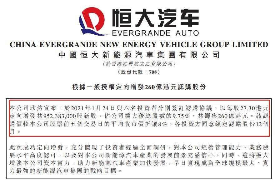 @新浪财经【恒大汽车:成功引入260亿战略投资】1月24日晚,恒大汽车发布公告,按前五个交易日平均收盘价折让8%的价格,向6名投资人定向增发9.52亿股新股,共引资260亿港元,各投资方自愿锁定12个月,这也是新能源汽车行业最大规模的股权融资之一。