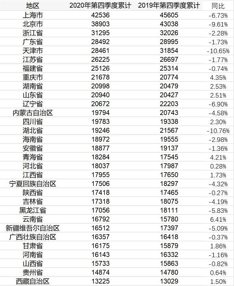 @第一财经【31省份居民人均消费:上海超4万元,广东位居第四】根据国家统计局最新公布的数据,2020年,共有11个省份的居民人均消费支出超过2万元,分别是上海、北京、浙江、广东、天津、江苏、福建、重庆、湖南、山东和辽宁。