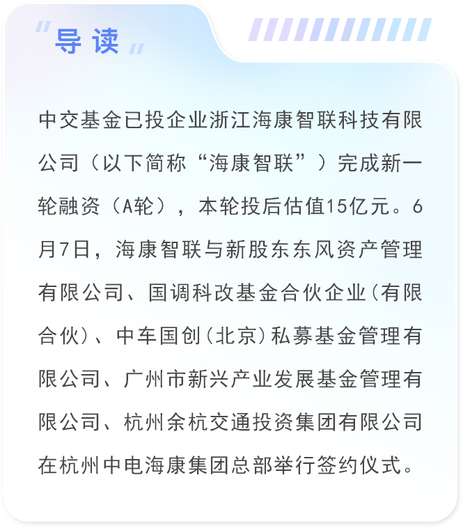 2021年4月,作为国内最大的两家高速公路运营主体,中交、招商局两家大型央企联合投资海康智联,打造了央企强强联合共同助力国家“交通强国”战略目标实现的典范。中交基金依托中国交建在交通领域丰富的产业资源,产业赋能助推海康智联业务快速增长,助力引进其他合作伙伴,促进企业实现从路端到车端的闭环,为海康智联市场价值的快速提升奠定了坚实的基础。