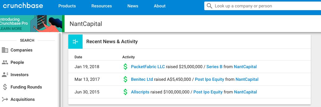 除此之外,其旗下还有夫妻两人共同创立的Chan Soon-Shiong Family Foundation基金和投资公司Nantcapital等。根据crunchbase的数据,Nantcapital目前投资了三个医疗相关项目,包括向医疗信息平台Allscripts砸入的1亿美元、注入PacketFabric LLC公司的2500万美元等。