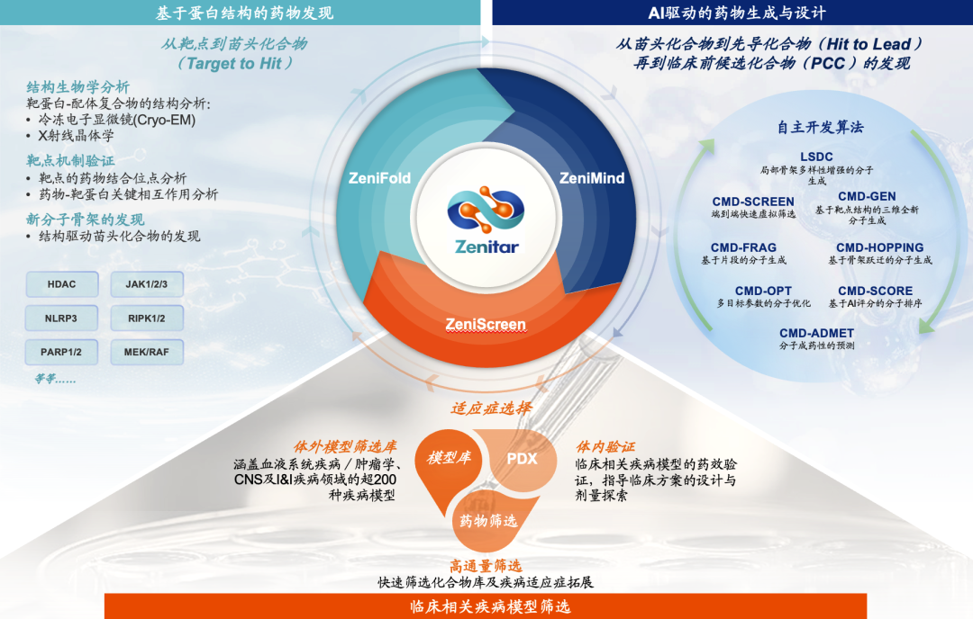 赜灵生物整合ZeniFold(结构生物学平台)、ZeniMind(AI药物发现与设计平台)与ZeniScreen(临床相关疾病模型筛选平台),构建起“三维一体”的协同研发引擎,形成从靶点识别到分子设计再到药效验证的闭环迭代体系。ZeniFold依托高精度蛋白结构解析,精准定位药物结合位点并指导分子骨架设计;ZeniMind基于自主研发AI算法,实现分子的智能化生成与多目标参数优化;ZeniScreen 则借助临床相关疾病模型,系统性完成药效验证与临床转化潜力评估。
