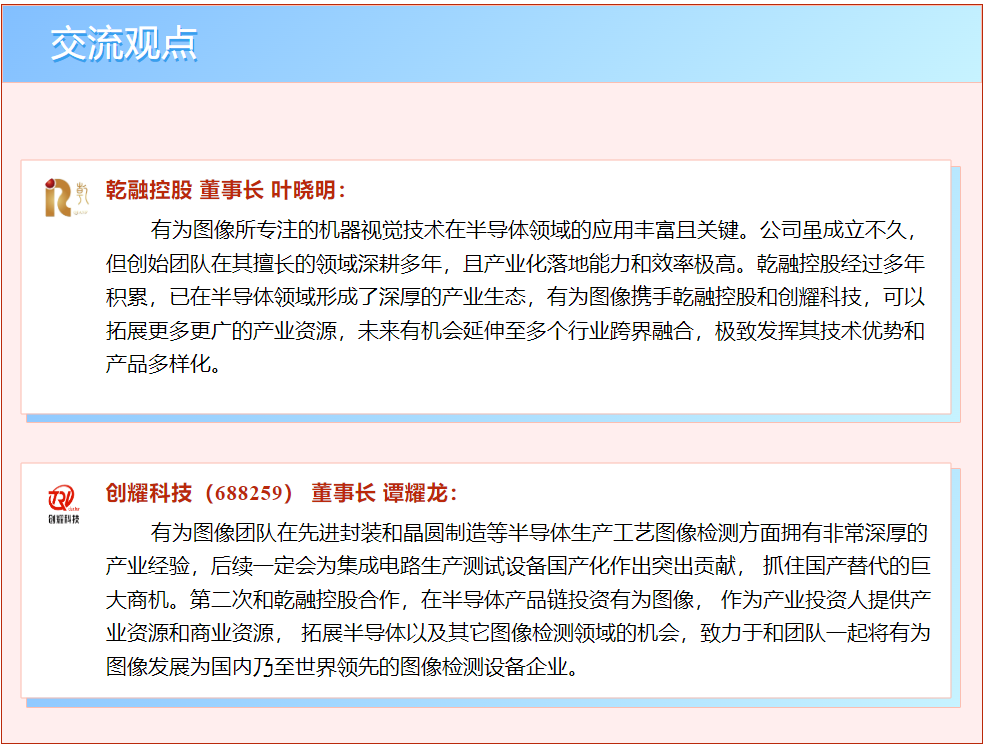 乾融控股在半导体领域投资生态已覆盖高端芯片设计、核心材料、关键设备、核心零部件、功率器件、先进封装等重点赛道,有为图像系乾融控股在此领域布局的第十五家企业,充分围绕已布局细分产业,逐步贯穿上下游及横向联动,自线延链构面,形成在同领域、跨领域的已投企业协同体系,打造具有乾融控股特色的多元投资创新生态集群。