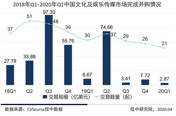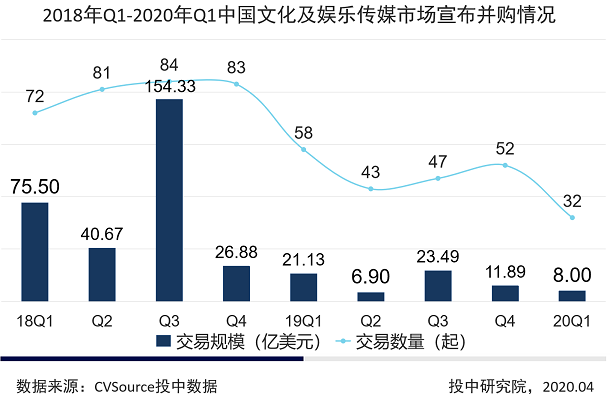 2020年Q1,文化及娱乐传媒行业共宣布发起32起并购交易,宣布并购交易数量同比下降44.83%,交易规模同比下降62.14%。