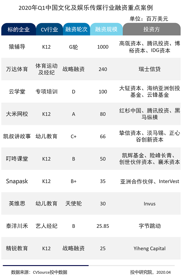 2020Q1文娱融资数量持续走低,猿辅导独占5成