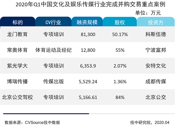 2020年Q1,文化及娱乐传媒行业完成21起并购交易,并购交易规模为2.87亿美元,交易规模同比下降66.9%,交易数量虽有所下降但幅度较缓,结合目前市场现状来看教育行业的整合给整个文化及娱乐传媒行业带来不少支撑。