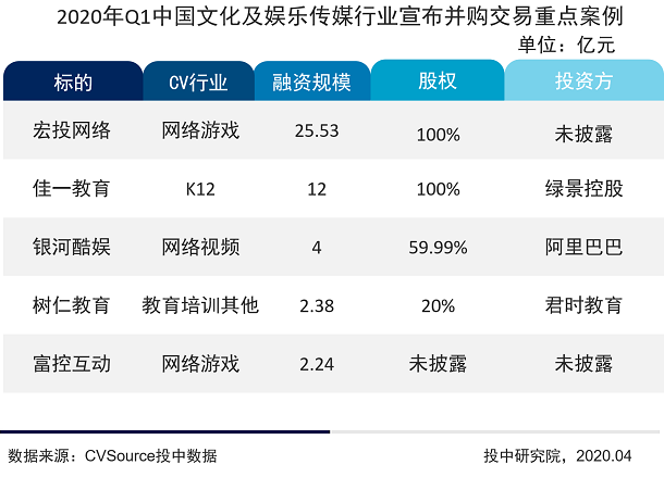 表3-2020年Q1中国文化及娱乐传媒行业宣布并购交易重点案例
