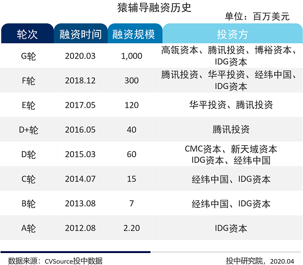 2020年3月31日,北京猿力教育科技有限公司(简称:猿辅导)获得由高瓴资本领投,腾讯、博裕资本和IDG资本跟投的10亿美元G轮融资,投后估值约为75亿美元。