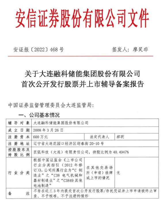 近日安信证券公布了大连融科储能集团有限公司发布首次公开发行股票并上市辅导备案报告,预示该公司正式开启冲击IPO之路。