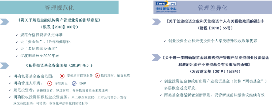 2018年以来,“资管新规”、财税55号文、资管新规细则、新《备案须知》等陆续出台,从备案、募资、管理等多方面加强私募基金监管,监管逐渐向全面化、规范化和差异化迈进。2019年10月,《关于进一步明确规范金融机构资产管理产品投资创业投资基金和政府投资产业投资基金有关事项的通知》(以下简称《通知》)发布,落实了“资管新规”对两类基金相关规定另行制定的要求。《通知》针对符合要求的两类基金配套适度“豁免”原则和新老划断原则,明确了两类基金的定义及过渡期安排,一定程度上缓解了两类基金募资压力,传达了国家鼓励LP早期投资、长期投资的利好信号。