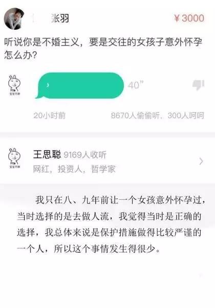 近日,某医院医生张羽在某平台中向王思聪提问:“听说你是不婚主义,要是交往的女孩子意外怀孕怎么办?”在40秒的回答中,王思聪爆料自己毫不手软:“我只在八九年前让一个女孩意外怀过孕,但后来大家的选择是流掉,我觉得是正确的选择。 但现在我的保护措施是非常好的,一般不会有意外了。”