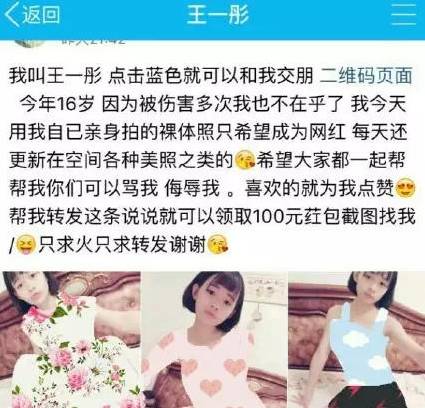 日前,微博上一则16岁少女为当网红自曝裸照的截图在网络上疯传,该女生称至今被伤害多次,所以不在乎,上传自己亲身拍的裸照希望能成为网红,还称大家帮她转发可凭截图向她要100元红包。陈年批周杰伦垃圾 昆凌回应称不必理会