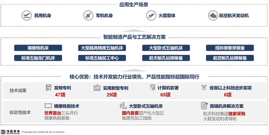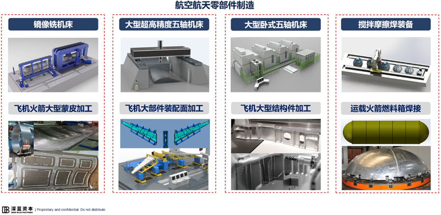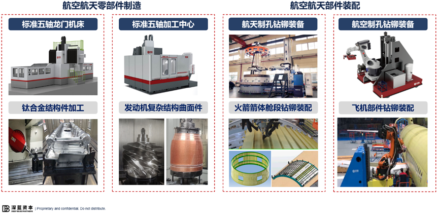 公司产业链自主可控,突破航空航天领域“卡脖子”技术,主打国产替代的高端制造。主要针对我国航空航天领域重大型号任务对高端制造装备的自主可控需求而研制,国外对于此类产品与核心技术对国内实施严格的技术封锁。公司交付世界首台三头并行镜像铣削装备,是国内唯一镜像铣装备供应商。同时公司成功落地国内首条国产化大型卧式五轴生产线,以及自主可控的国产飞机装配生产线。