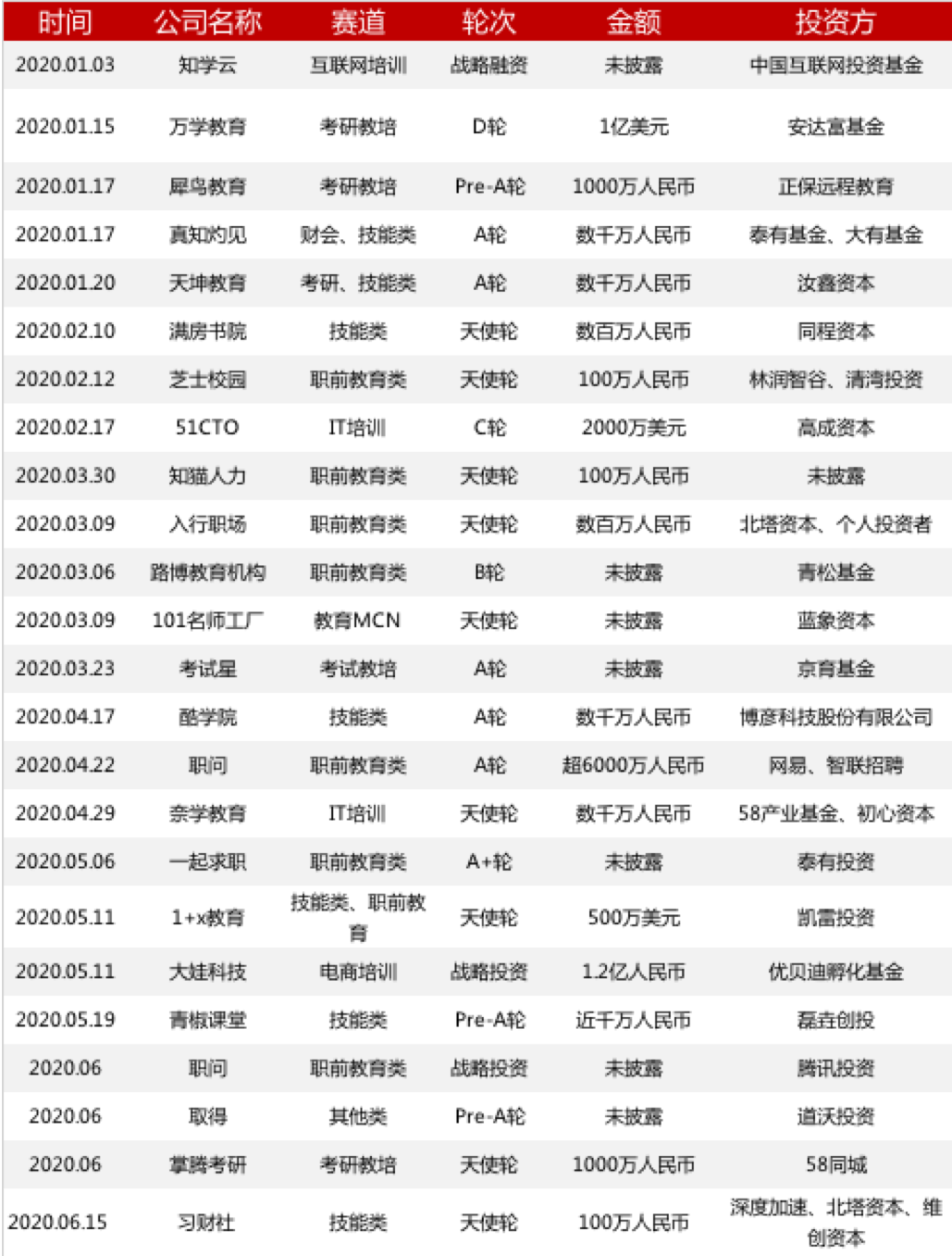 回看 2020 年上半年教育一级市场职业教育赛道的投融资情况,共计 24 笔融资,少则一百万人民币,多则 1 亿美元。整体来说,整个赛道呈现冰火两重天。