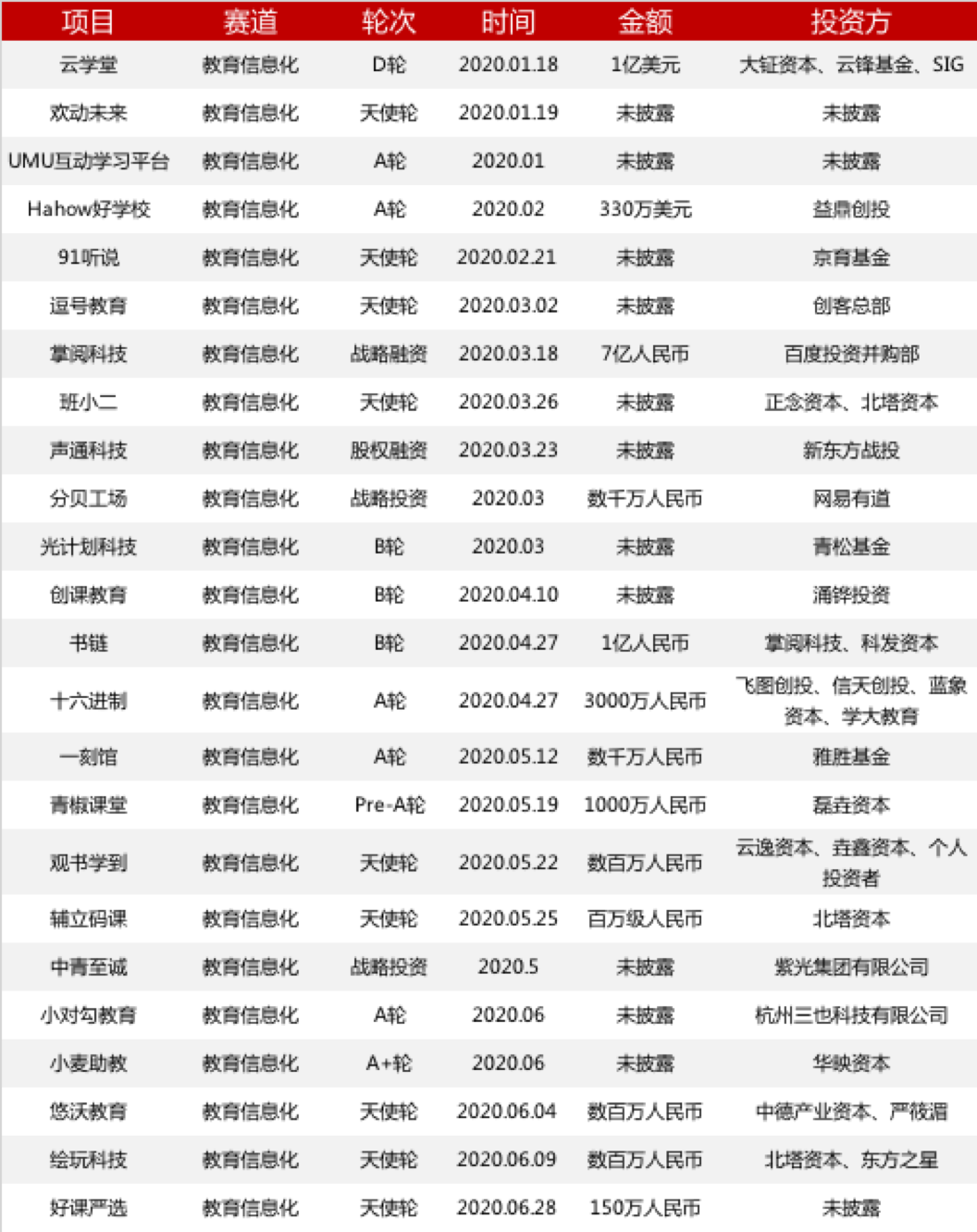 然而回看 2020 年上半年教育行业一级市场,与新基建故事相呼应的是 24 笔与教育信息化有关的融资事件,过半融资金额为数百万人民币或未披露,少数如云学堂、掌阅科技、书链获得至少上亿人民币融资,但整体并不如预想中火热。