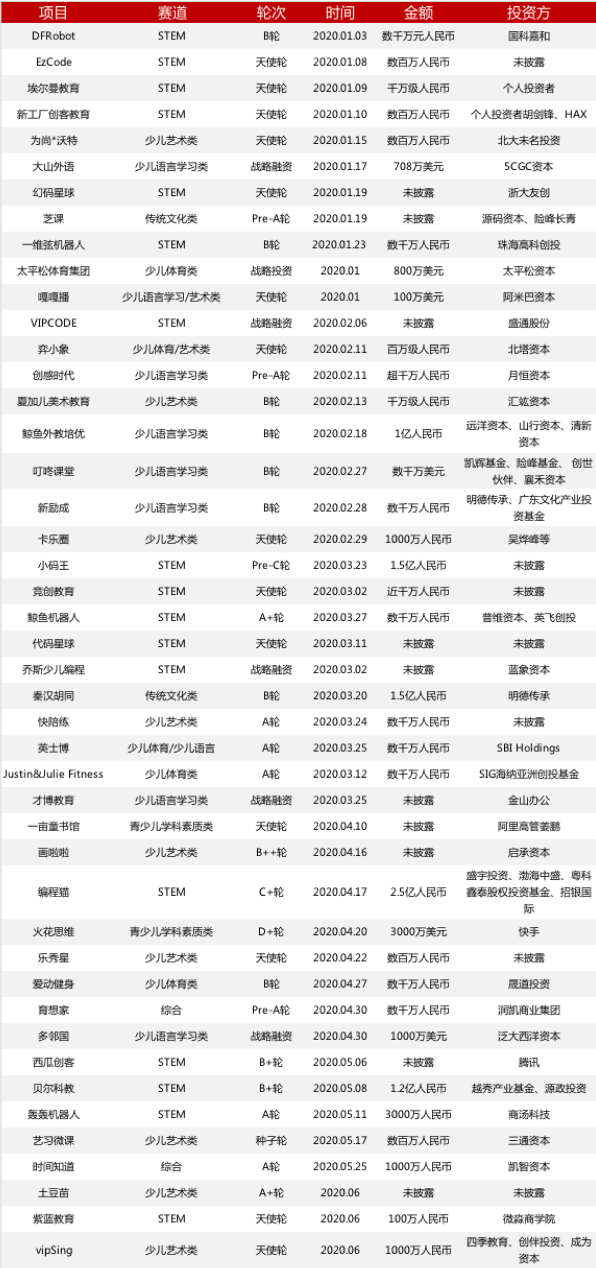 纵观 2020 年上半年素质教育领域的投融资事件,对已到了资本化时刻的素质教育赛道而言,除了体现出在线趋势和分化特征,还体现了少儿英语、少儿编程、数理思维、大语文等细分赛道持续热门。