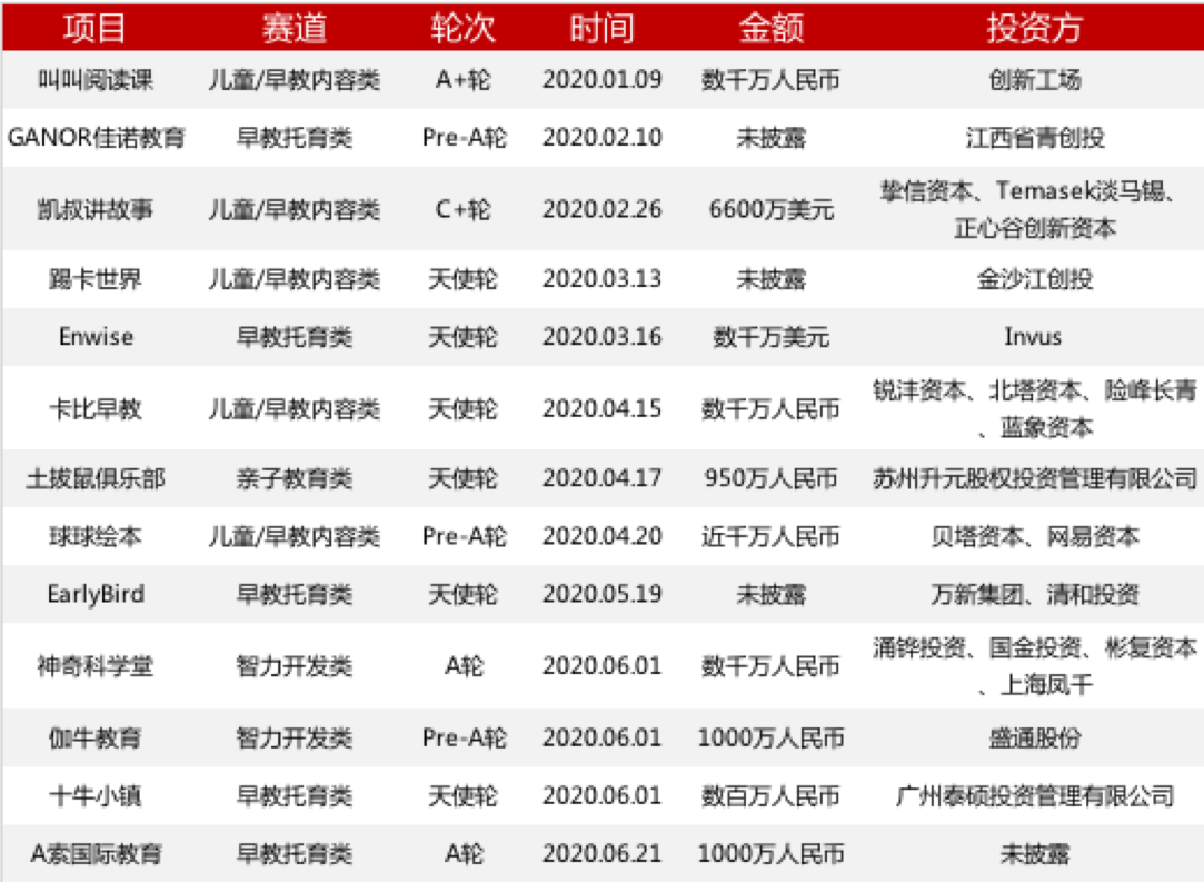 纵观 2020 年上半年,疫情阴云笼罩之下,早幼教赛道融资机构仅 13 家,除凯叔讲故事在 2020 年 2 月 26 日完成 6600 万美元 C+轮融资之外,融资金额多为千万人民币左右。早幼教赛道的行业关键词成了「自救」。