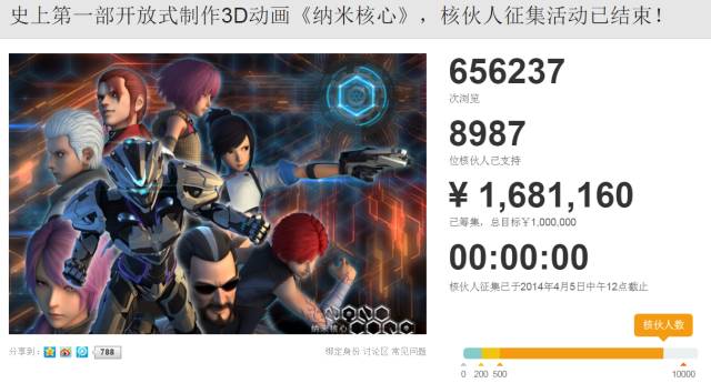 彼时《纳米核心》刚刚播出半个月,没有依附正片宣传,也没有更多的市场推广。为了测试真实粉丝的付费情况,海岸线动画在支持项目设置中拒绝了企业捐助和广告,仅通过5000粉的微博、2000粉的公众号、8000粉贴吧三个渠道与粉丝形成联系,但众筹的结果出人意料。34天时间,8987人参与,筹集金额1681160元,突破百万只用了2天16个小时,打破了当时国内文化产业圈众筹的记录。