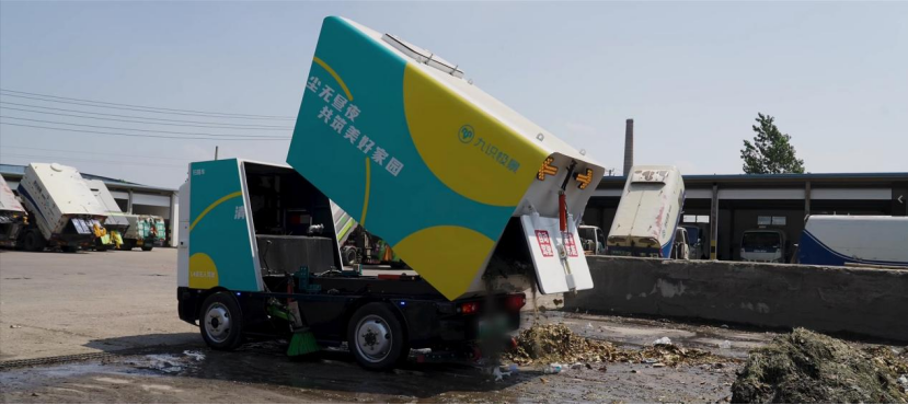 九识极景研发的无人扫路车正在进行垃圾清倒作业