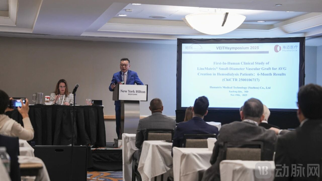 图为海迈医疗创始人邱雪峰教授在VEITHsymposium2025年会上报告临床研究结果