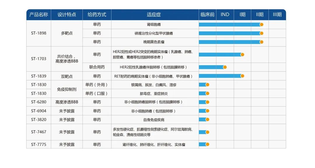 ST-1898目前处于临床II期,是基于SigmaHit®定向药物设计筛选功能而开发的一款多靶点酪氨酸激酶抑制剂,通过三元并环核心结构的全新设计,实现了对多个与肿瘤的发生和发展密切相关的靶点的有效抑制,有利于对这些靶点的协同、联合作用,进而产生对肿瘤的持续抑制。ST-1898由行业头部PI领导开展针对肾癌、黑色素瘤、甲状腺癌等肿瘤的临床试验,已有的临床数据展现了良好的安全性和疗效,实现了药物设计的初衷。