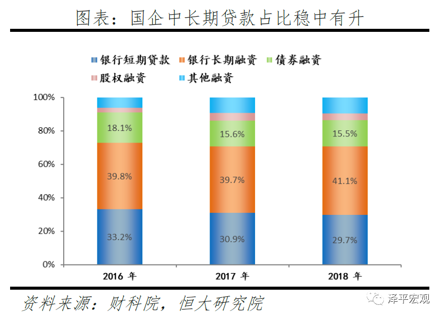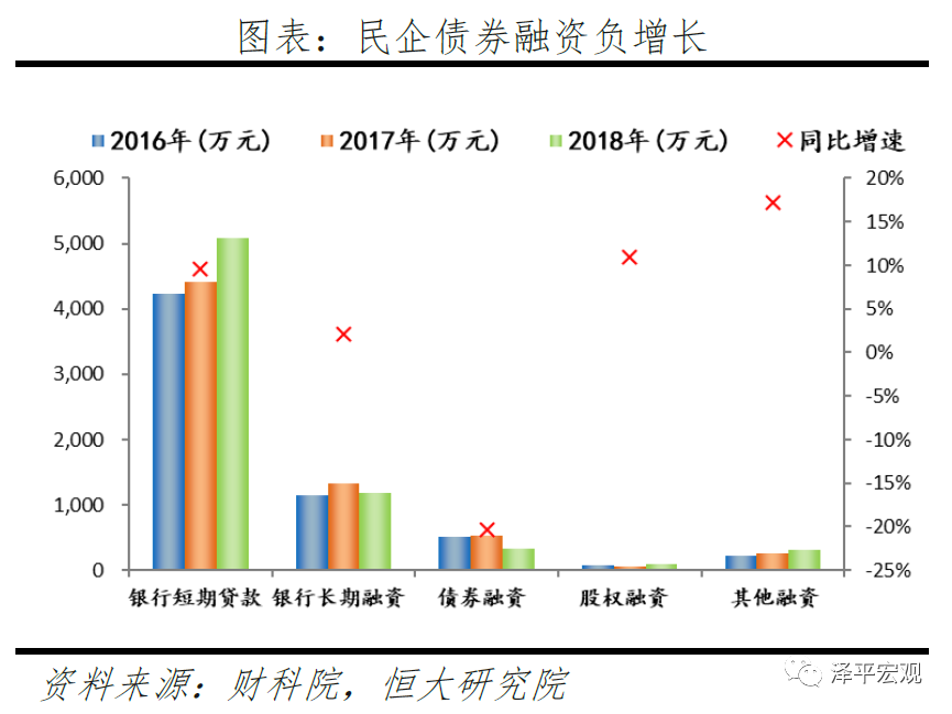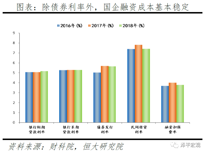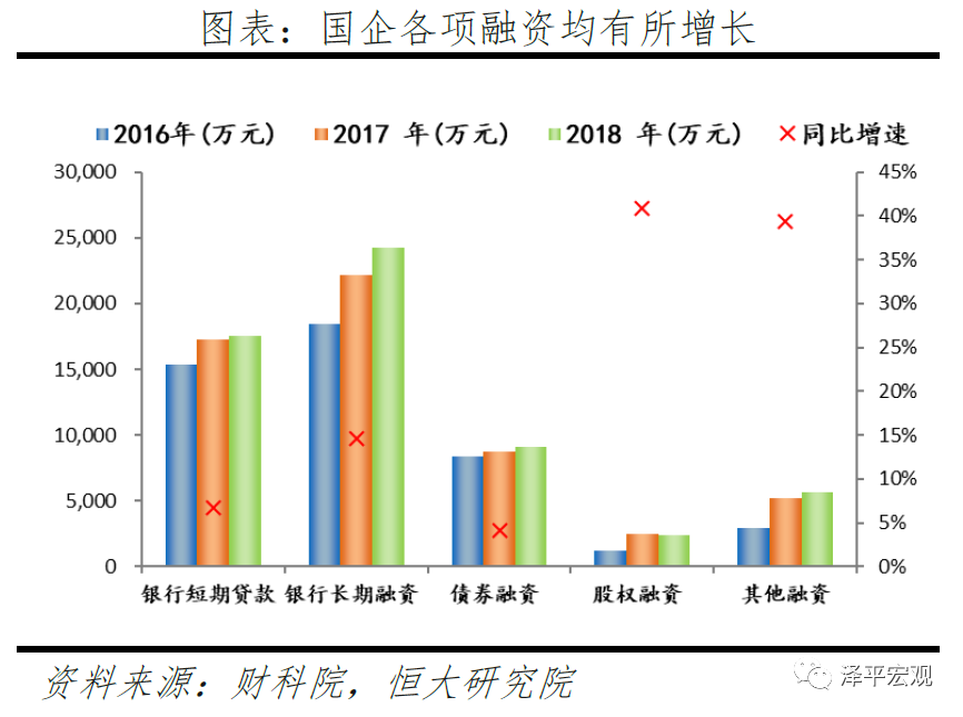 从分项增速看,国企各项融资来源均有所增长,且增速远高于民企,民企增速低,债券融资甚至出现负增长。2016-2018年,国有企业银行短期贷款、银行长期贷款、债券融资、股权融资和其他融资平均融资规模复合增速分别为6.7%、14.6%、4.2%、40.8%和39.4%,同期民营企业分别为9.6%、2.1%、-20.4%、10.9%和17.2%。除银行短期贷款外,国有企业的各项融资增速均大幅超过民营企业,民营企业的债券融资更是大幅萎缩20.4%。