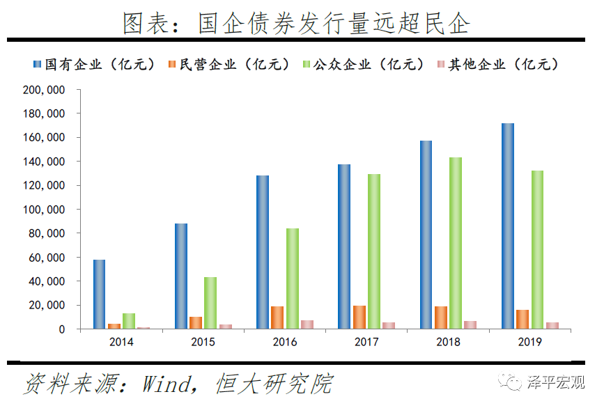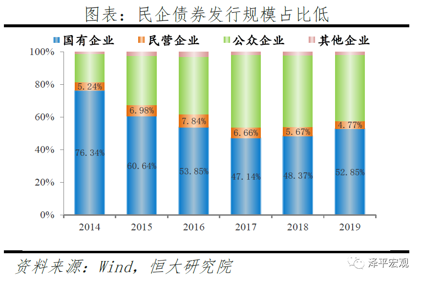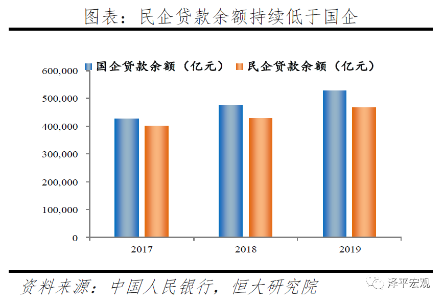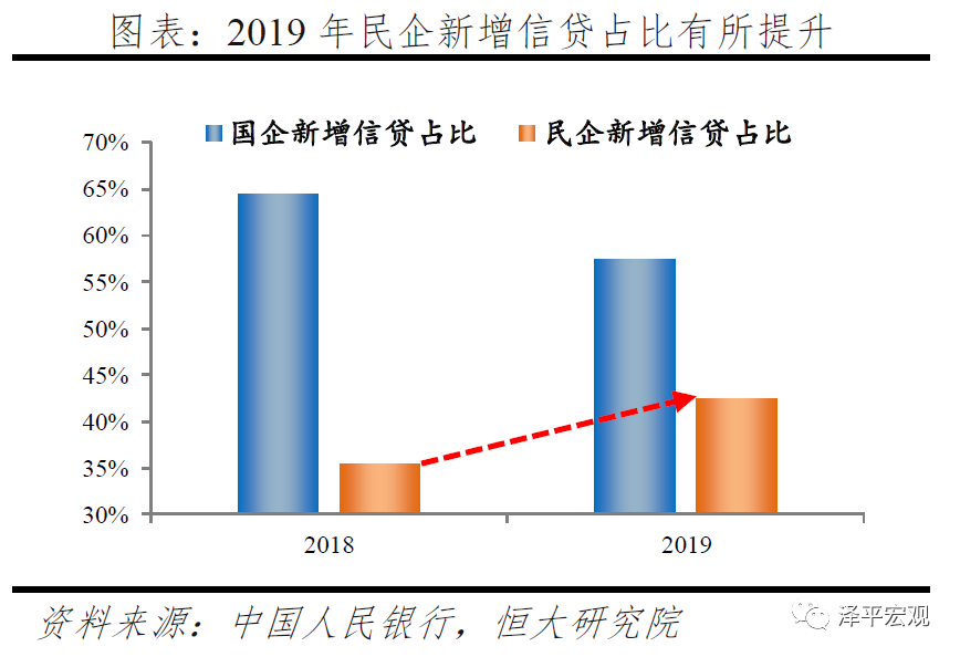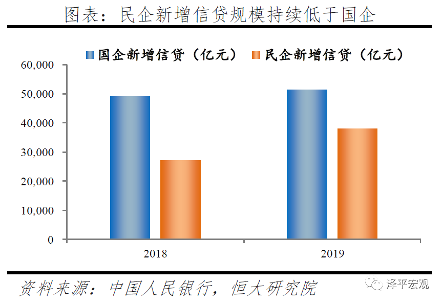 增量视角下,民企新增信贷规模、占比持续低于国企,2019年民企信贷融资有所改善但幅度有限。从规模来看,2018-2019年,广义口径民企新增贷款分别为2.7万亿元、3.8万亿元,国企新增贷款分别为4.9万亿元、5.1万亿元,2018年民企新增贷款仅为国企的55%。从占比来看,2018-2019年,广义口径民企新增贷款占企业新增贷款比重分别为35.5%、42.5%,国企占比为64.5%、57.5%,民企占比持续低于国企,但2019年有所改善,提升7个百分点。一方面,2018年以来,政策持续发力,改善民企融资环境。2018年11月,习近平主席召开座谈会,否定“民营经济离场论”。随后,银保监会提出争取三年后民企贷款占新增企业贷款比重不低于50%,央行出台“三支箭”政策缓解民企融资难题。但另一方面,受制于金融体系、金融机构等因素,改善幅度仍然有限,民企信贷资源与经济贡献远不匹配。民营企业以仅占40%的信贷,贡献了50%以上的税收,60%以上的GDP,70%以上的技术创新成果,80%以上的城镇劳动就业,90%以上的企业数量。